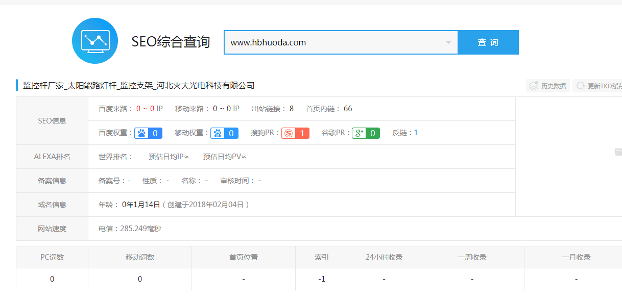 SEO優化人士將網站利用site:www.hbhuoda.com的形式查看了網站的內容的收錄情況,起初網站只收錄了網站的首頁,內頁都沒有進行收錄。我們技術人員利用sitemap、百度推送以及站長統計的代碼放入網站中,使之網站內頁能夠讓百度蜘蛛抓取全部頁面以便持續收錄提高排名。