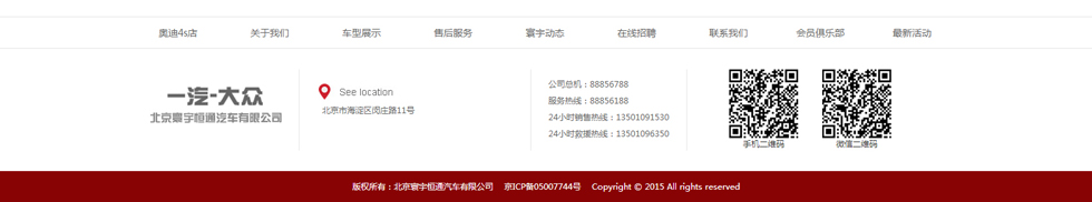 北京寰宇恒通汽車有限公司是一汽-大眾奧迪品牌的特許經銷商,是北京市一類維修企業。公司占地面積12000多平方米,其中新車展廳首層面積1800平方米、二手車展廳面積2500平方米,客戶休息區800平方米。可以提供近100多個維修工位,室外停車位350個。公司位于西北四環外的閔莊路汽車大道,鄰近玉泉山、香山和頤和園,交通便捷,是新老奧迪車主在海淀的家。